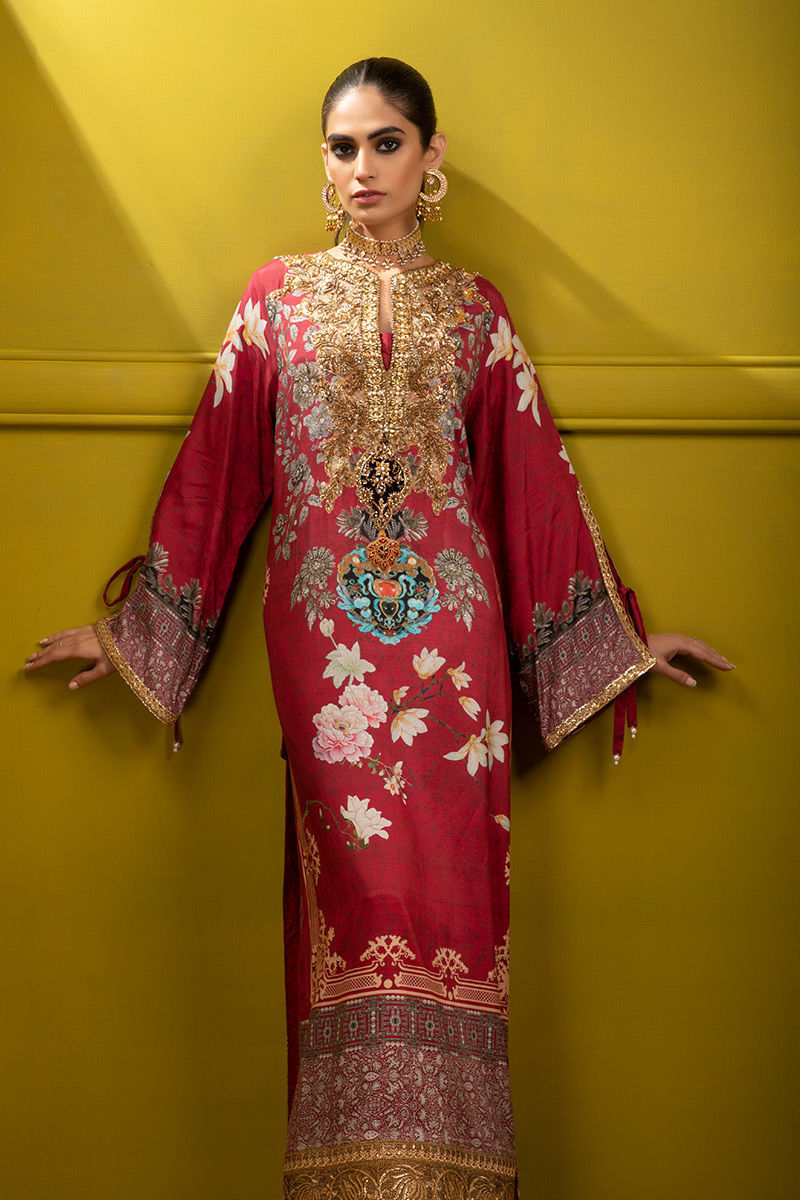 Fabric:Shirt: Sheesha SilkPant: Khaddi SilkRelaxed original Shamaeel silhouette floral and geometrical print on silk fabric detailed handcrafted neckline designed using antique gold dapka, nakshi, sequence, gota, pearls, tila thread and antique maroon stones and finished with handmade antique tila thread and sequence lace.