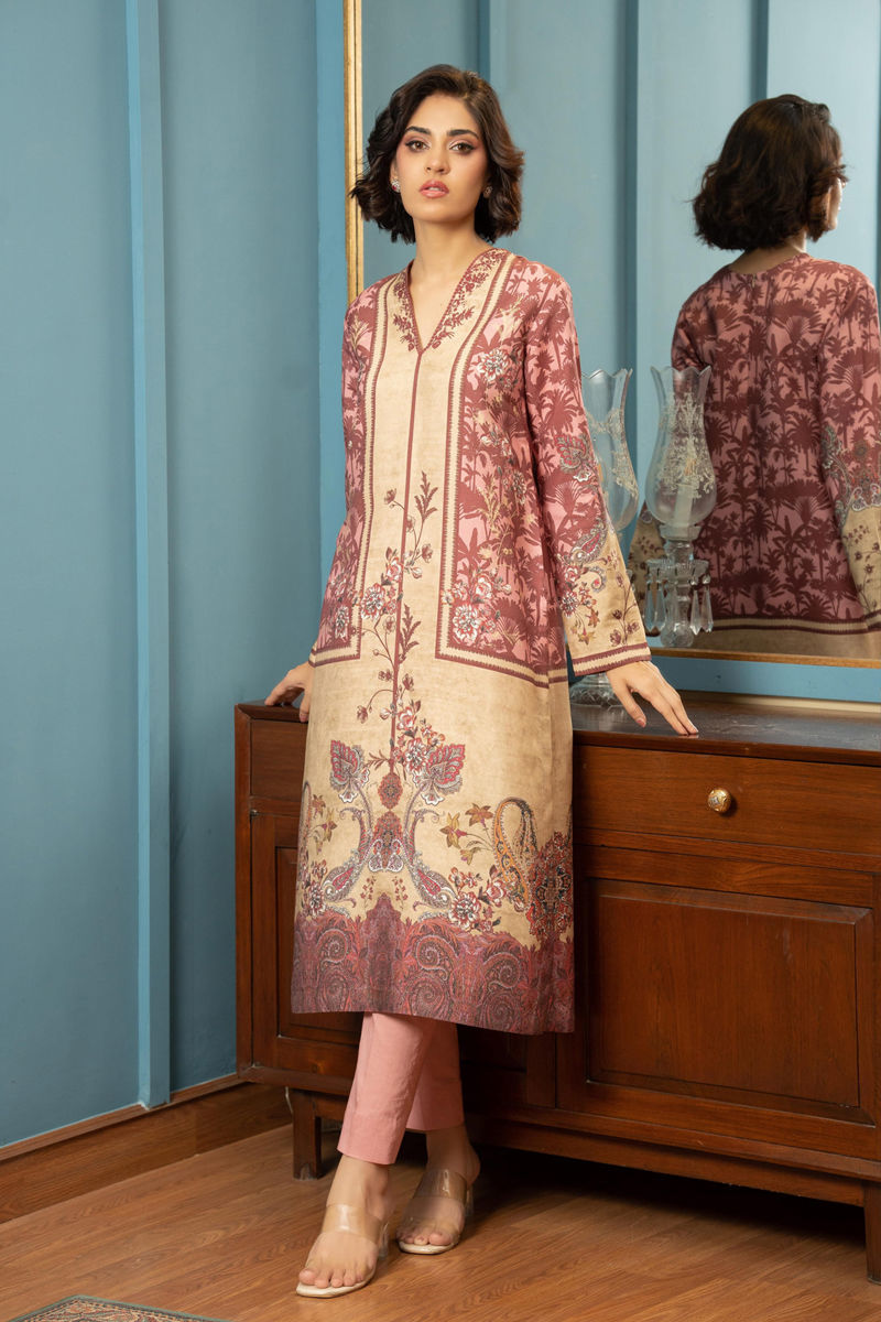 This Shamaeel's outfit features a digitally printed shirt adorned with intricate floral and paisley patterns in warm pink and beige tones. The design creates a luxurious look, maintaining a lightweight and comfortable feel. Paired with plain pink rose-colored pant, it offers a refined yet effortless style perfect for summer all-day wear, perfect for Eid, casual outings, daytime events.