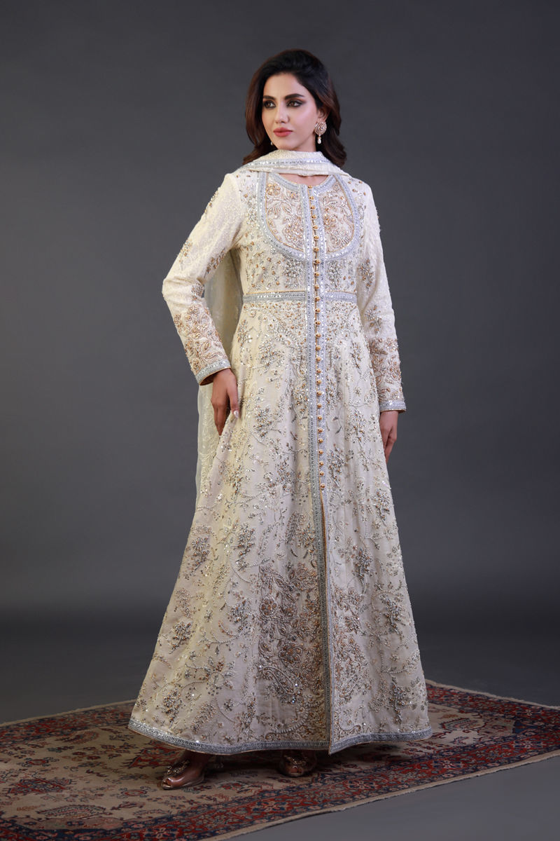 This exquisite front-open ensemble exudes timeless elegance, crafted from luxurious fabric in a soft ivory hue. The intricate embellishments feature delicate hand embroidery in silver and gold, shimmering sequins, and glistening beadwork, creating a mesmerizing effect. The structured silhouette is adorned with Mughal-inspired patterns, enhancing its regal charm. A subtle silver-lined border traces the neckline, front panel, and hem, adding a sophisticated touch. The sheer dupatta, finished with embroidered edges, drapes effortlessly to complete the graceful look. Perfect for weddings, receptions, and grand festive occasions, this masterpiece blends traditional craftsmanship with contemporary sophistication.