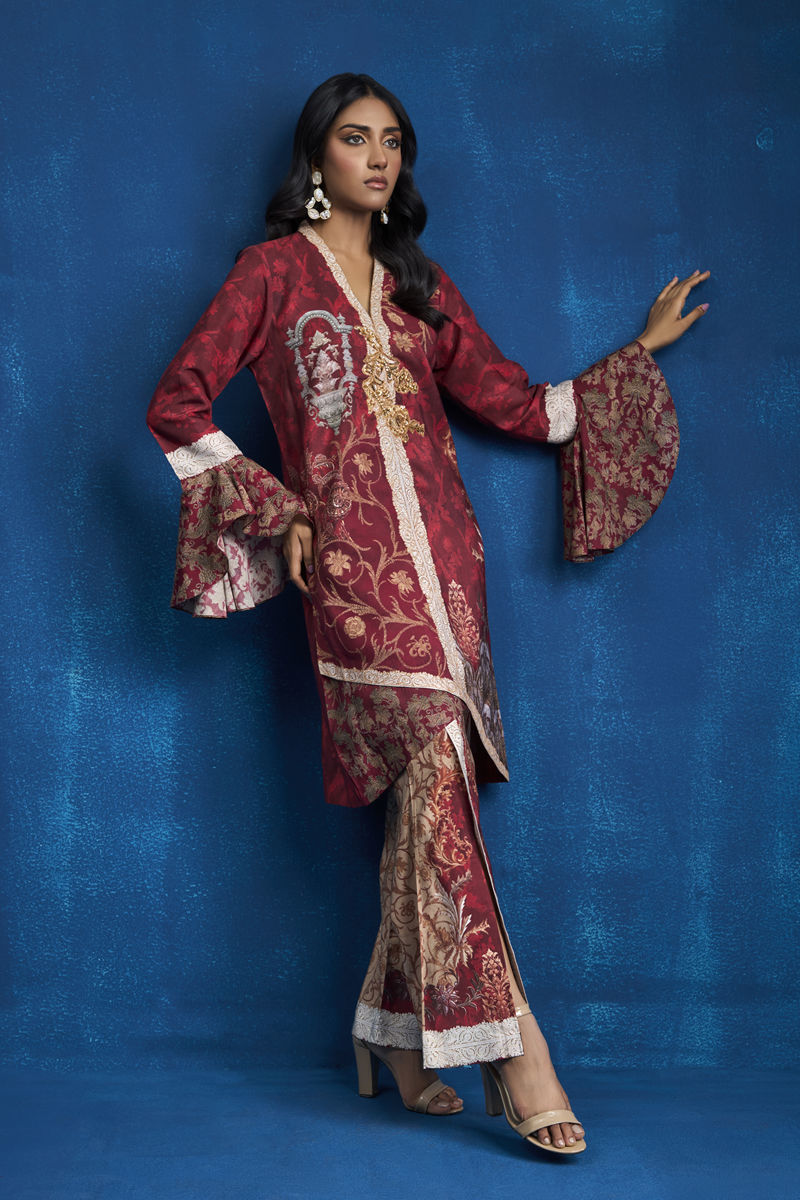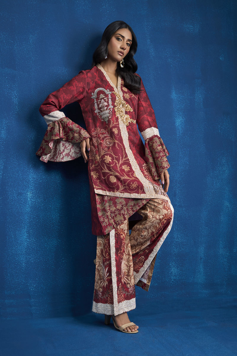 Elevate your ethnic wardrobe with this luxurious two-piece outfit made from Khaadi silk fabric. The ensemble features a printed shirt and stylish slit pants, inspired by the grandeur of Baroque ornaments, combining traditional elegance with a modern silhouette. The neckline is adorned with Tila embroidered floral motif, meticulously enhanced with Zardozi work appliqued on the neckline, adding a regal touch to the outfit.