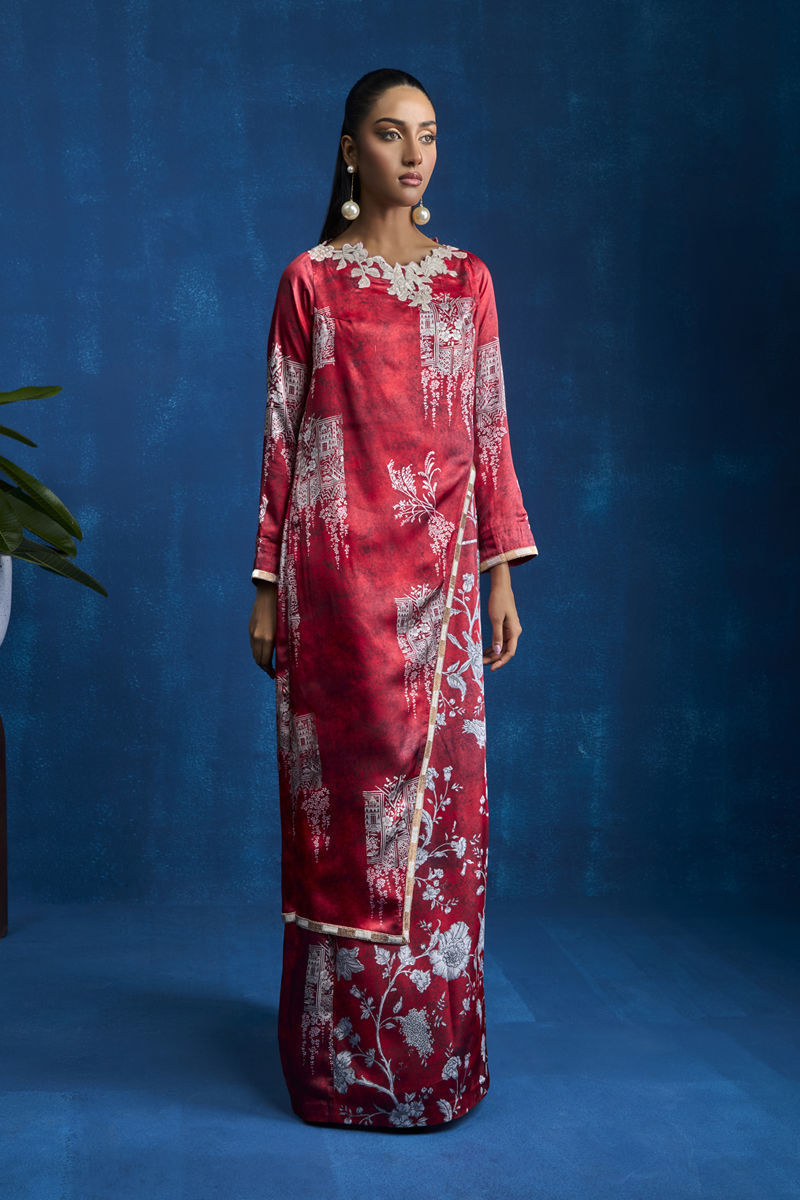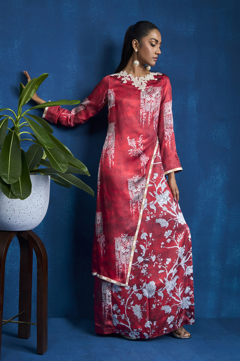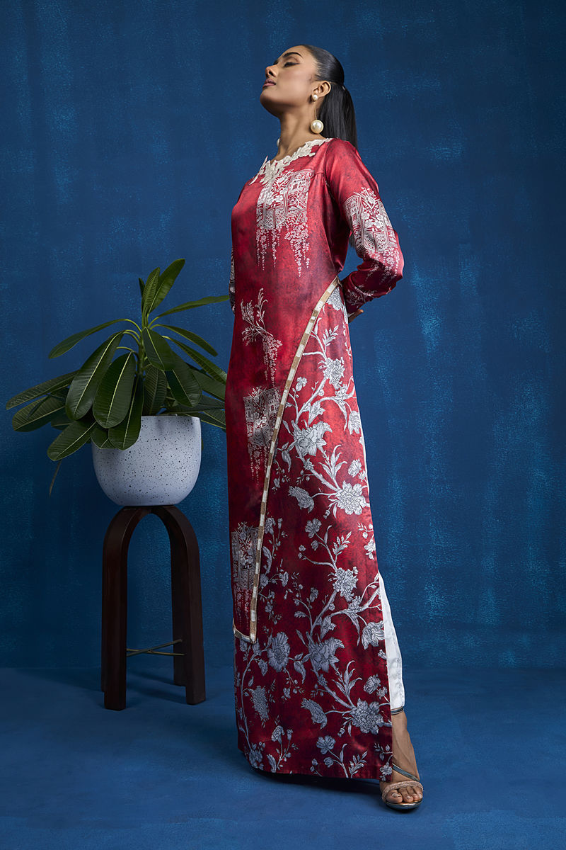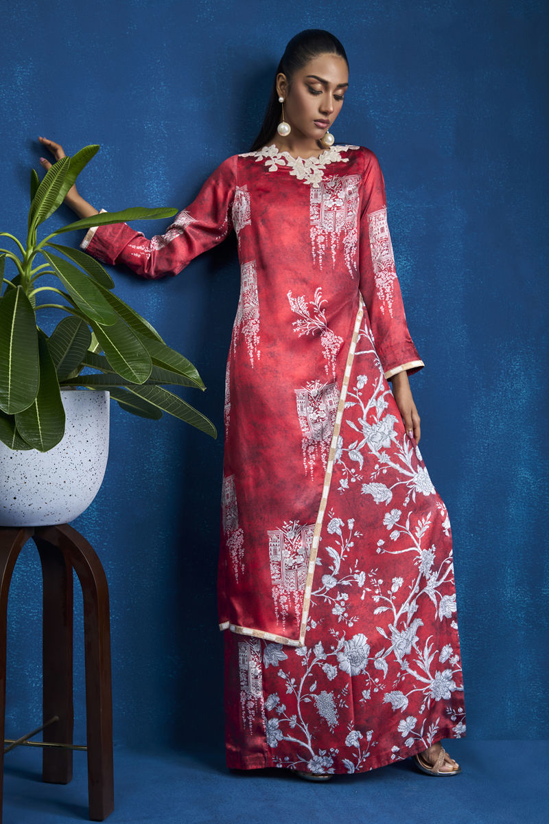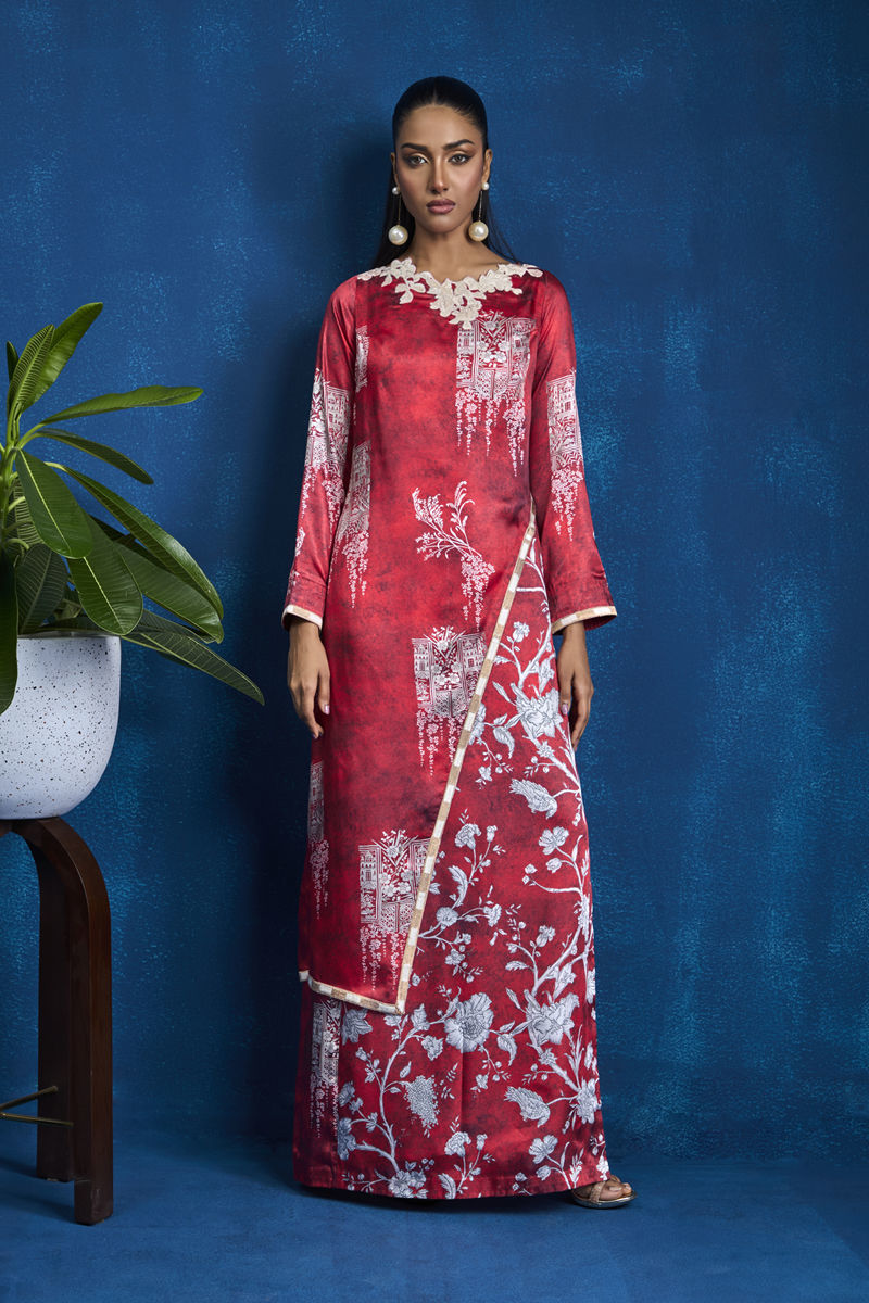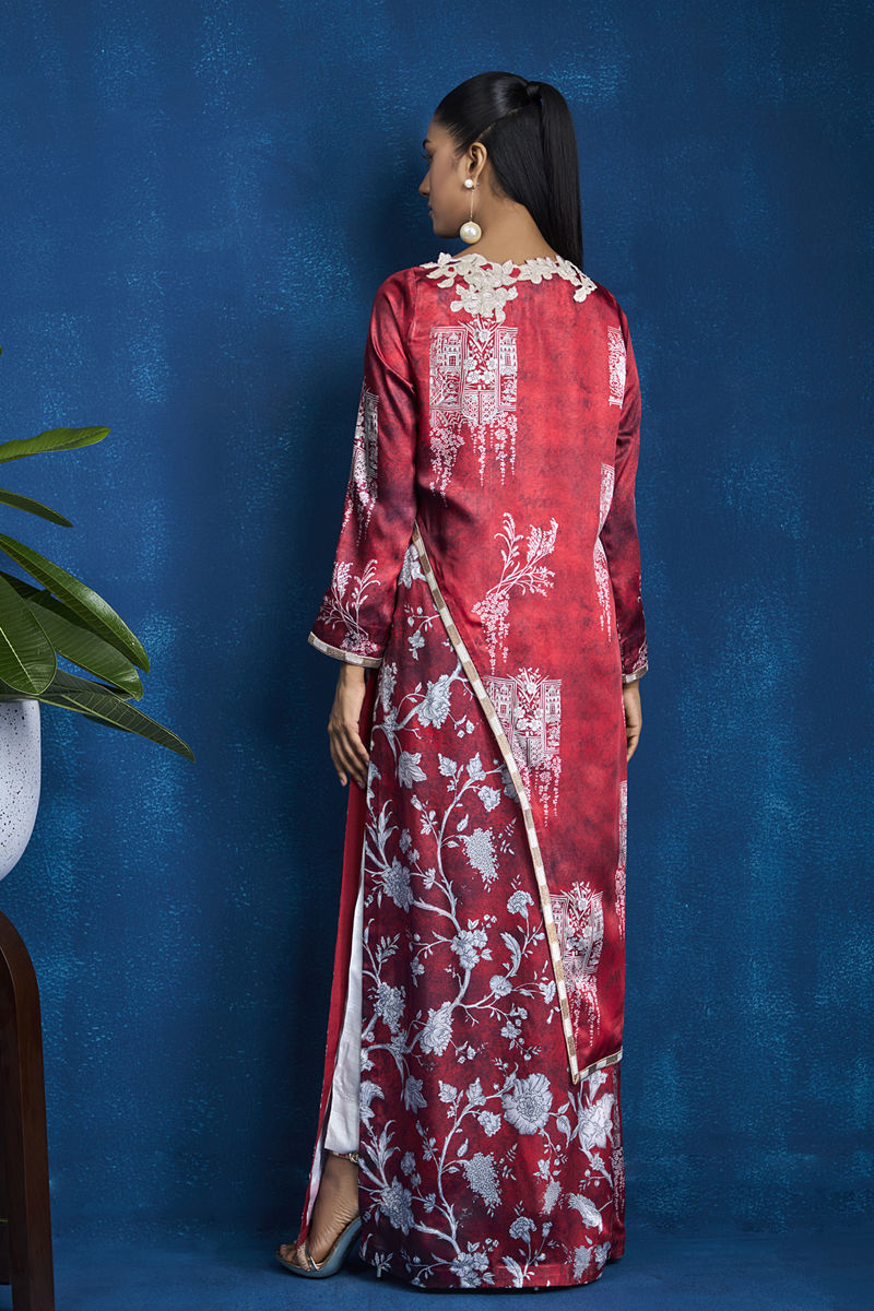 Immerse yourself in the timeless elegance of this double-layered long shirt, designed to make a statement with its rich colors and intricate detailing. Crafted from luxurious Rode silk fabric, this outfit features a stunning blend of floral and architectural prints, creating a unique and sophisticated aesthetic. This outfit is finished with machine embroidered ivory resham and tila thread lace.
