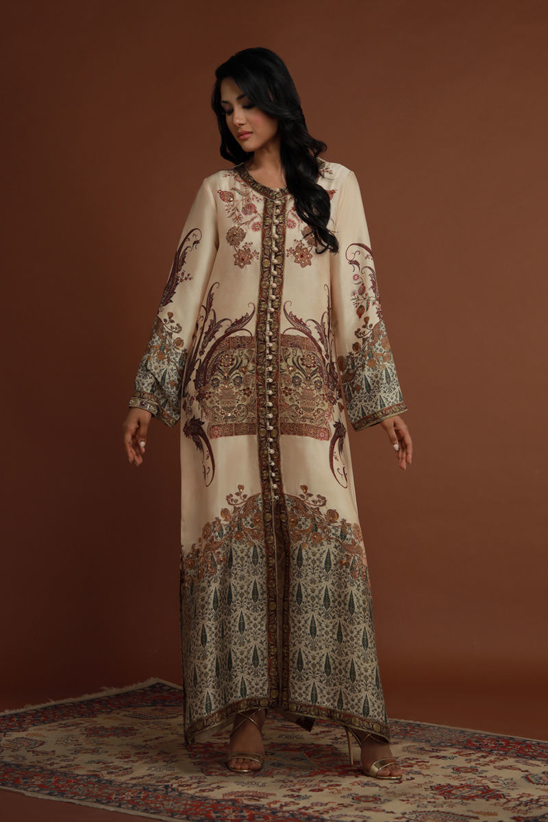 Originally, Shamaeel's print is showcased in a long, straight, front-open silhouette, featuring a regal Baroque-inspired design on opulent sheesha silk. Intricately adorned with gold and antique gold-outlined, elaborate embellishments, the ensemble radiates timeless grandeur. The neckline is embellished with pearls and sequins.