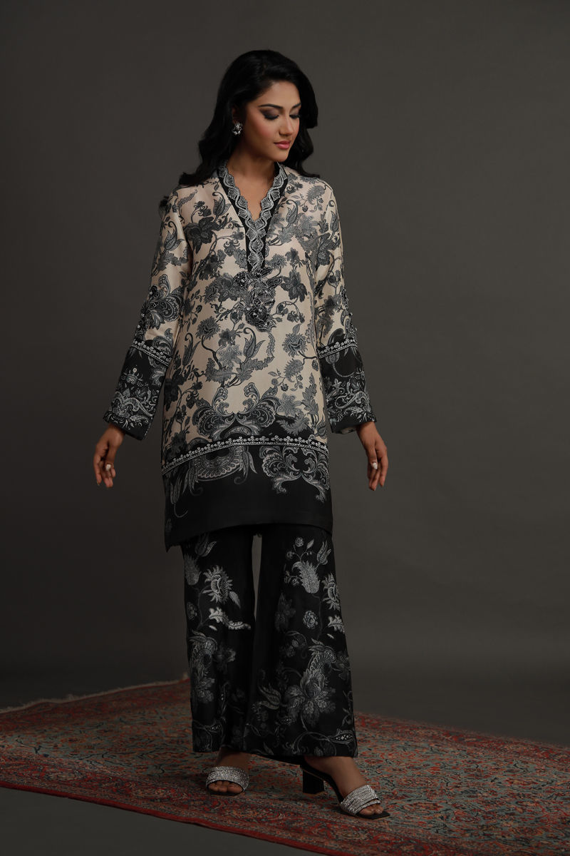 A beautiful black and white floral print on Ivory-colored silk fabric with a short straight silhouette. The shirt features a printed black and silver border on neckline, with delicate handcrafted motif appliqué. Intricate silver and black embroidery adorns the shirt daman and handcrafted motifs on the sleeves, all finished with an embroidered border. The pants are adorned with appliqué at the bottom and are paired as shown in the picture.
