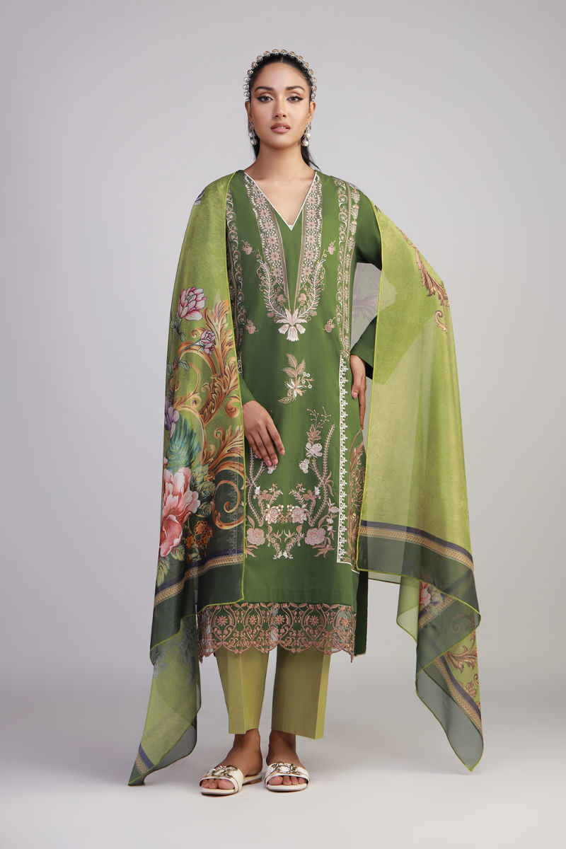 FabricShirt & Trouser: Premium LawnDupatta: SilkA refreshing green ensemble that’s perfect for summer, featuring a fully embroidered shirt paired with solid trousers for a clean, balanced look. The digitally printed Silk dupatta showcases an asymmetrical floral composition, adding a modern twist to traditional charm. A must-have addition to your warm-weather wardrobe.