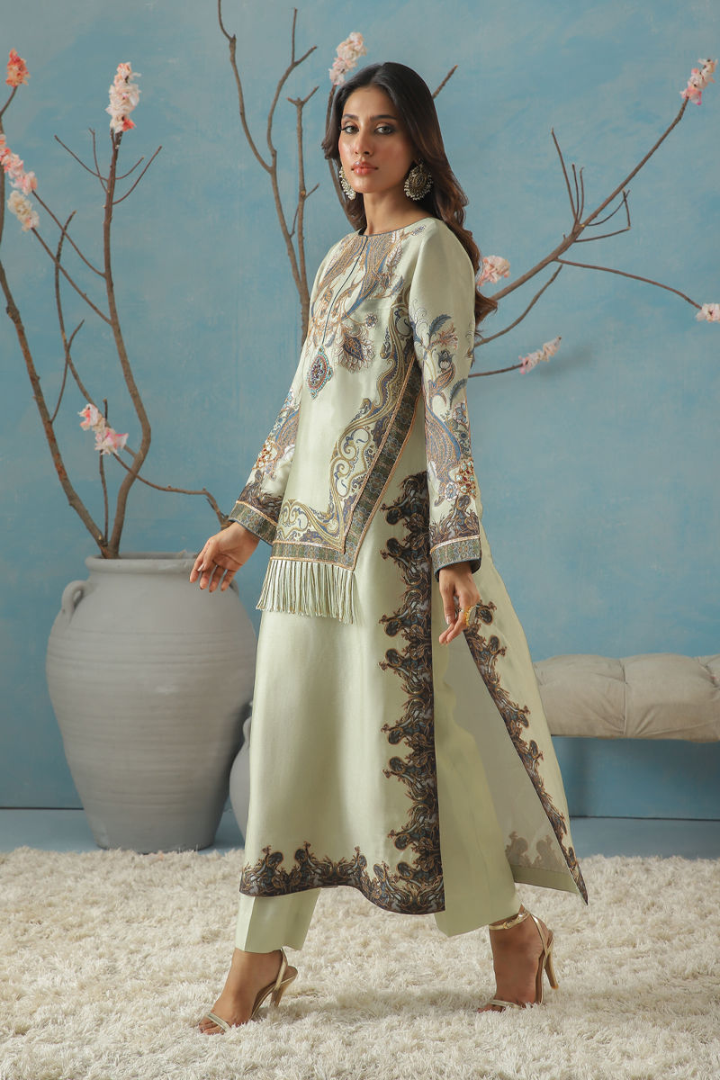This look is a soft and graceful expression of vintage-inspired eastern luxury, with intricate details and refined color play. A sage green long straight kurta crafted from a silky, flowy fabric. It features a tapestry-style digital print with baroque and paisley motifs in shades of rust, antique gold, and navy. The neckline is modest with an embellished medallion-like centerpiece, while the hem is finished with an elegant fringe detail that adds movement and charm. Full-length sleeves showcase ornate, mirror-symmetrical artwork in warm tones, giving it a regal, almost Kashmiri feel. Borders on the hem and sides of the shirt enhance its classic silhouette. It comes with a coordinated straight pants in matching sage green keep the look minimal and polished.