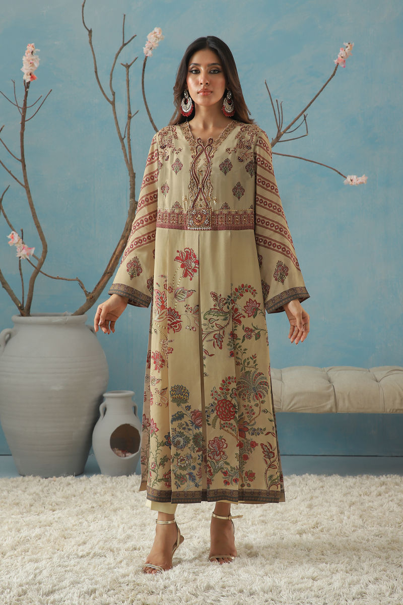 FabricShirt: SilkPants: SilkA graceful A-line long shirt featuring box pleats, adorned with intricate Mughal chintz-inspired bright red motifs beautifully outlined in golden thread. Detailed embellishments highlight the neckline and belt, adding a touch of elegance. It is paired with the effortlessly plain trouser for a balanced and sophisticated look.