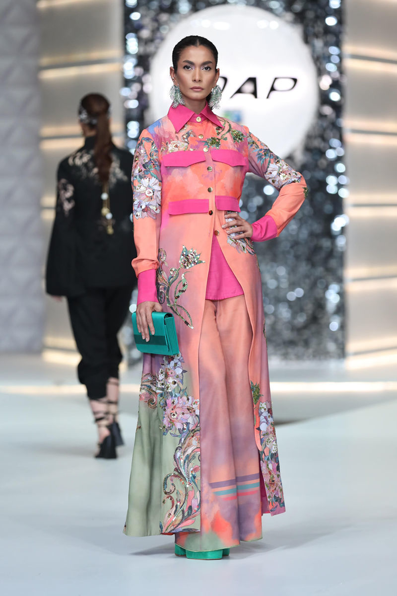 This look is a luxurious, artistic eastern–western fusion with rich color play and intricate embellishment. A long shirt-style coat in dreamy sunset shades (coral, peach, rose pink, and soft sage) featuring floral and baroque-inspired prints combined with hand-embellished crystal and beadwork motifs. It has a classic collar, chest flap pockets, button-down front, and contrasting fuchsia cuffs and pocket trims along with a solid bright magenta inner peeks through the front opening, adding a bold contrast pop beneath the printed coat. Coordinated wide-legged trousers in muted ombré tones of peach fading into mint green, subtly reflecting the hues from the overcoat’s print for a cohesive gradient effect. Overall, it’s a statement outfit that merges couture structure with painterly floral patterns for an elegant, modern festive look.