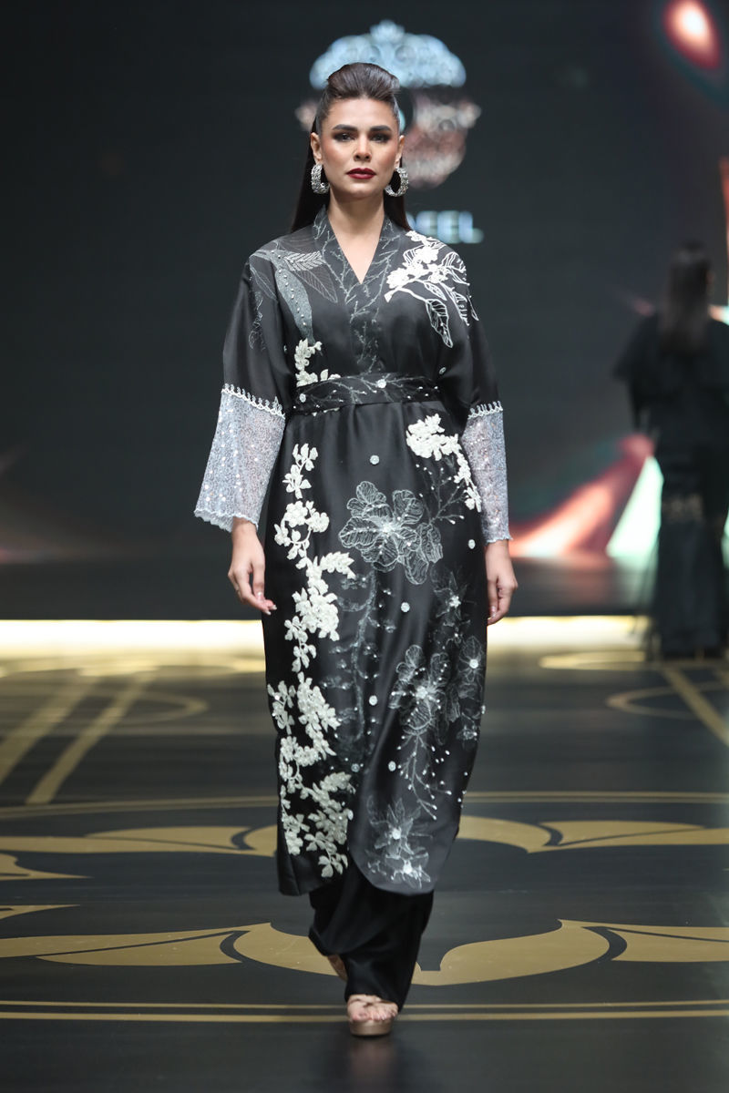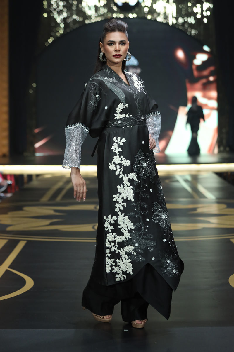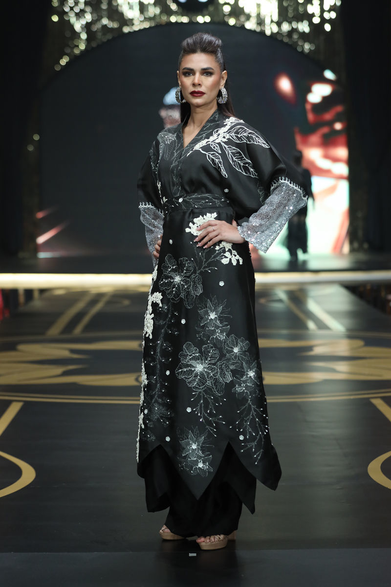This is a dramatic and elegant black couture ensemble with a modern eastern silhouette. A luxurious black satin silk wrap-style long shirt inspired by a kimono cut, featuring a deep V-neckline and wide obi-style waist belt. The front is richly adorned with intricate white and silver floral embroidery cascading diagonally down the body, accented with delicate crystal embellishments for sparkle with statement sleeves transition from solid satin to glittering silver sequin fabric from the elbow down, finished with a scalloped crystal-trim edge, adding a glamorous contrast. It comes with a draped black dhoti-style trousers peek from beneath the high-low hemline, maintaining fluidity and movement. Overall, it’s a contemporary festive look mixing kimono-inspired tailoring with traditional embroidery exuding sophistication and power.