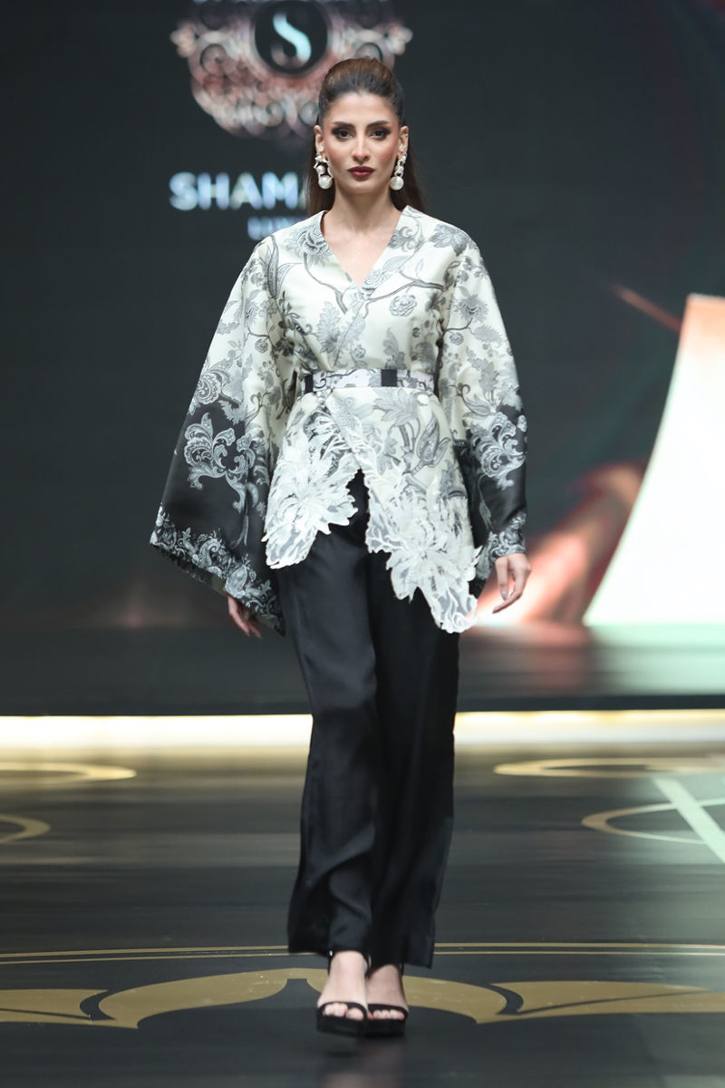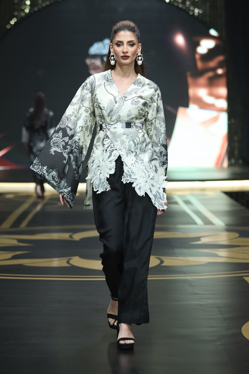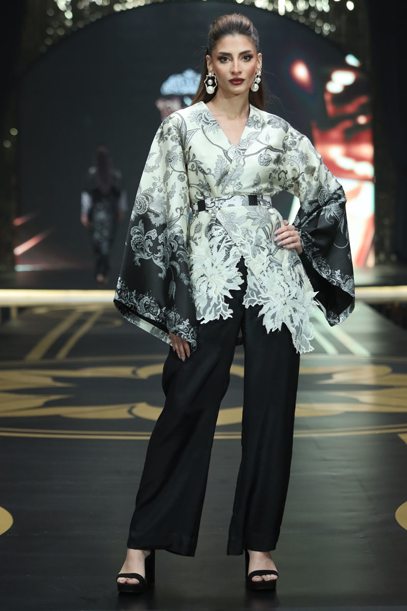 This outfit is an elegant monochrome statement with a luxe, contemporary silhouette. A kimono-inspired ivory tunic with an all-over black and grey botanical print. It features wide, draped sleeves, a soft V-neckline, and a fitted waist cinched with a metallic silver belt. The hemline is richly embellished with intricate white appliqué floral embroidery that creates a sculpted, scalloped effect and adds textural dimension. It comes with a sleek straight-cut black satin pants that fall fluidly to the ankles, providing a clean and minimal contrast to the ornate top. The look beautifully blends eastern kimono aesthetics with modern tailoring and couture-style embroidery, offering a sophisticated evening or festive wear ensemble in timeless black and white.
