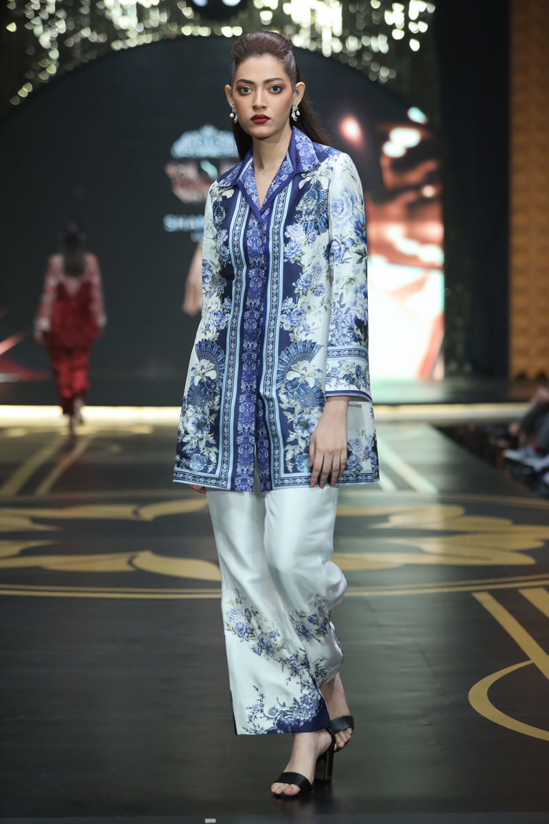 This look is a refined and feminine coordinated set with a timeless porcelain-inspired aesthetic. A long silk button-down shirt featuring a crisp lapel collar and tailored shape, beautifully printed in porcelain blue-and-white floral and chinoiserie motifs. The print placement is framed with vertical blue borders that draw the eye downwards, elongating the silhouette. Cuffed sleeves continue the print detail for a polished finish. It comes with a straight-cut satin trousers in a soft ivory base, delicately decorated with scattered blue floral print along the hem, creating a subtle, elegant continuation of the top pattern. It’s a graceful ensemble that feels classic yet contemporary, perfect for sophisticated daywear or festive lunches.