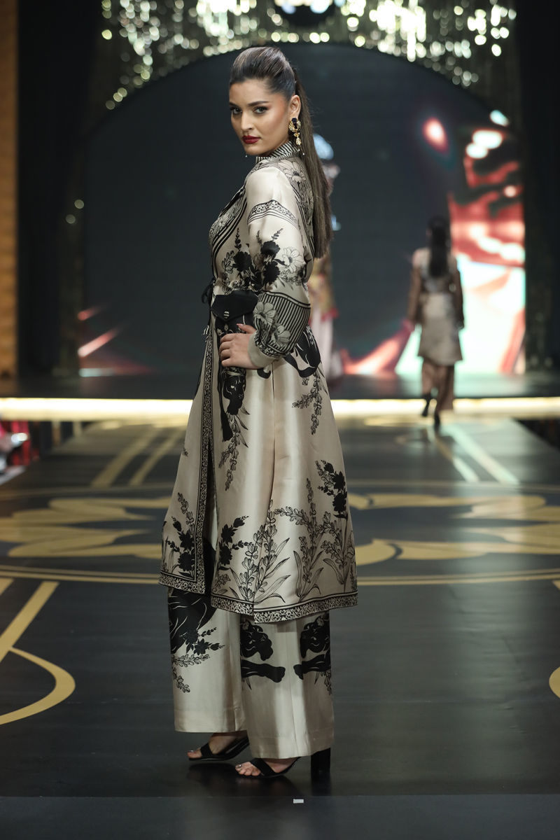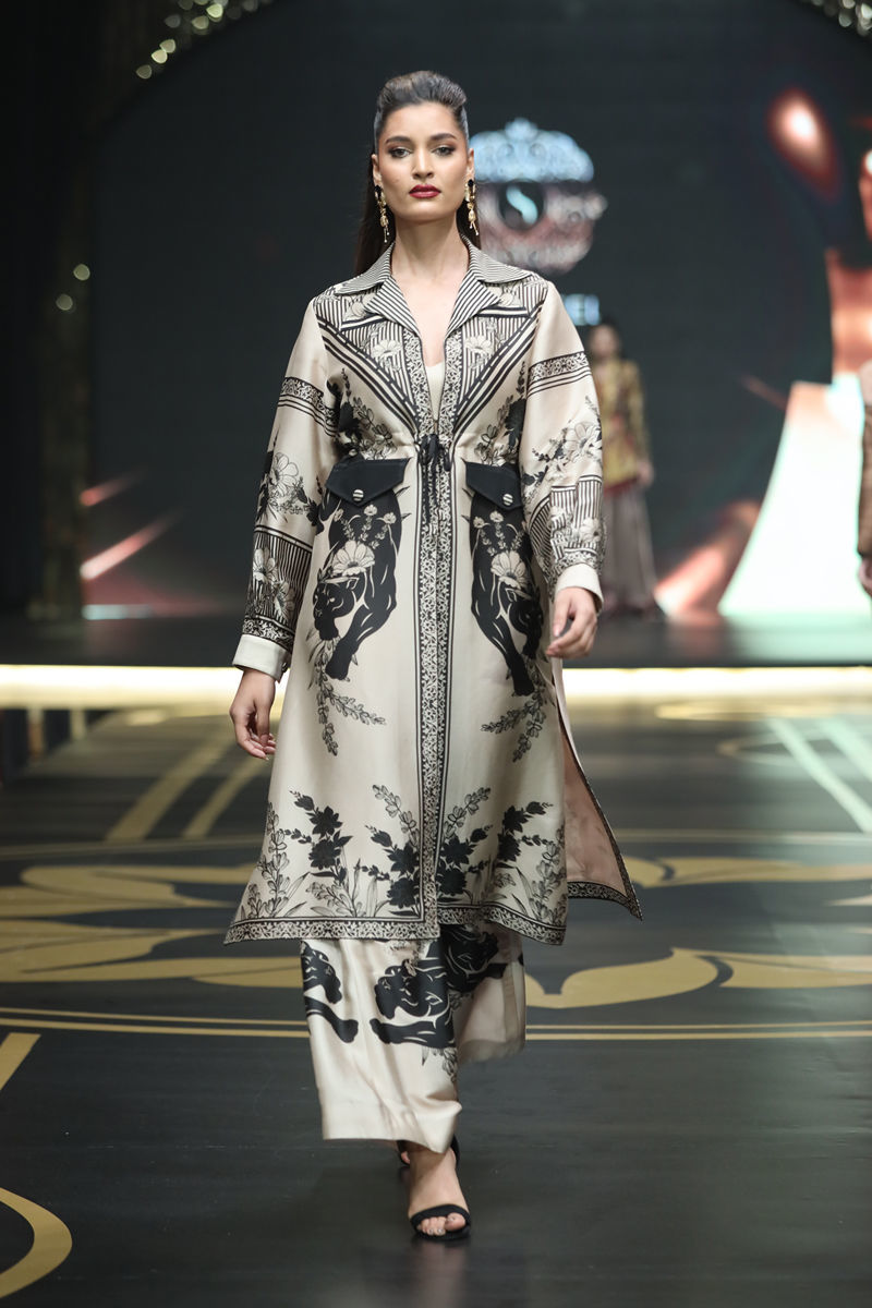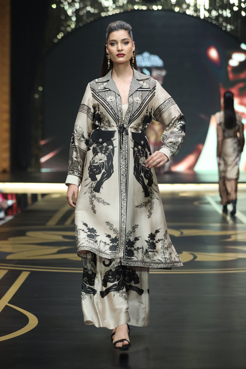 This ensemble is a striking, art-inspired satin look that fuses couture-lined tailoring with bold, graphic prints. A long, ivory satin coat-dress with a structured V-neck collar and buttoned front. It’s adorned with intricate black illustrative prints featuring panthers, botanical vines, and architectural borders giving it a dramatic, almost toile de Jouy-meets-jungle aesthetic. The bodice is fitted with paneling to cinch the waist, and accented by contrasting black flap pockets which add definition and edge. It comes with a flowing wide-leg matching trousers in ivory satin, carrying the same bold black panther and botanical motifs for a seamless coordinated finish. A luxurious statement look strong, artistic, and regal combining tailored structure with eye-catching print storytelling.
